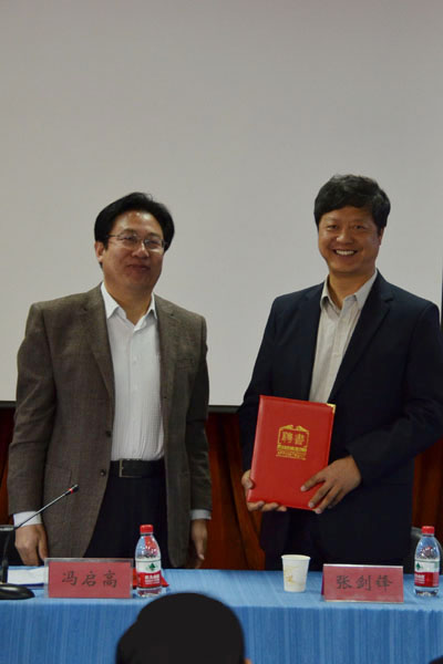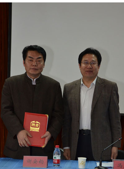 仪式上,冯启高为两位教授颁发了聘任证书并发表了讲话。冯启高对两位著名书法家被聘为我校客座教授表示热烈的祝贺,对艺术学院近年来在学科专业建设方面取得的成绩给与了充分肯定,并对艺术学院今后的发展提出两点希望和要求:一是树立发展意识、质量意识、特色意识、开创意识,争取一切发展的有利条件,推进艺术学院各项工作的快速发展;二是希望能引进更多的名家担任我院客座教授,同时,创造更好的条件,使他们能更好地将书画艺术传授给学生。