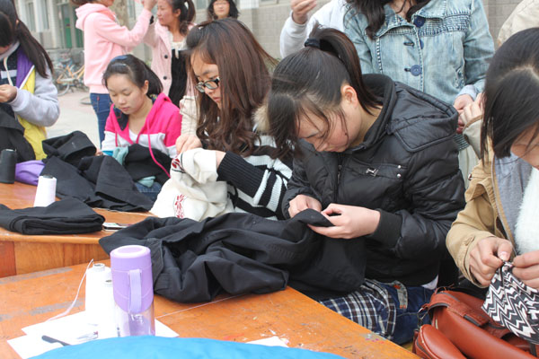 图为服装学院青年志愿者们正在开展学雷锋义务缝补活动