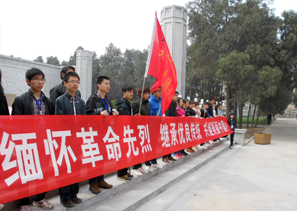 清明节期间,我校大学生通讯社组织了“ 缅怀革命先烈,继承优良传统 共建美丽中国”的主题活动。4月4日早晨,我校大学生通讯社成员来到新乡市烈士陵园,祭奠英灵,寄托哀思,表达青年学生的敬仰和钦佩之情。同学们清扫烈士墓碑,瞻仰烈士雕像,向烈士敬献白色菊花。同时,同学们在烈士墓前发表演讲,并组织大家在“ 缅怀革命先烈,继承优良传统 共建美丽中国”的横幅上庄重地签上自己的名字。