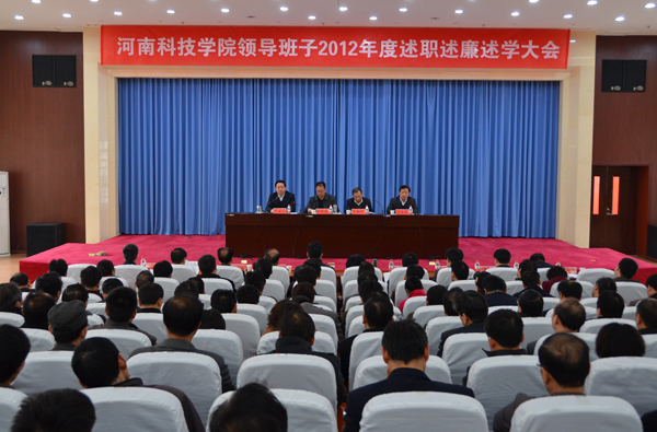 校党委书记牛书成代表校领导班子作述职述廉述学报告,从十个方面对学校领导班子2012年度工作进行了全面总结:一是坚持理论武装,学习型党组织建设深入推进;二是坚持固本强基,基层党建工作不断加强;三是坚持党管干部、党管人才,人才干部队伍建设开创新局面;四是坚持德育为先,思想政治工作和文明创建卓有成效;五是坚持“质量立校”,人才培养取得新成效;六是坚持“科技兴校”,科技创新展现新活力;七是坚持学生为本,招生就业和学生管理取得新成绩;八是坚持开放办学,校企、校地合作取得新空间;九是坚持统筹兼顾,各项管理服务工作取得新成效;十是坚持惩防并举,党风廉政建设开辟新局面。