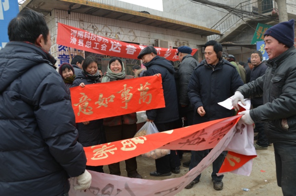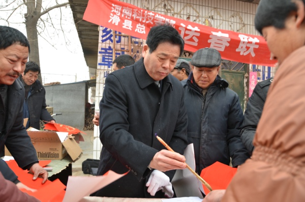 金蛇起舞,辞旧迎新。为了认真贯彻落实党的十八大精神,发挥学校先进文化的辐射力,丰富农村文化生活,促进新农村建设,1月29日,在2013年新春佳节即将来临之际,受滑县总工会的邀请,我校书画协会到滑县慈周寨乡举行“义务送春联活动”。校书画协会一行7人,在滑县总工会负责同志的陪同下,冒着严寒来到乡亲们中间,挥毫泼墨,将一幅幅火红喜庆的春联送到了老乡们的手上。