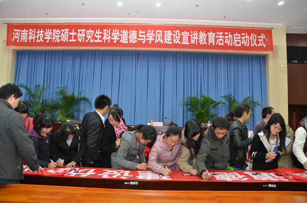 校党委副书记张玉珍宣布“研究生科学道德与学风建设宣讲教育周活动”诚信签名活动开始,与会人员依次在印着“崇尚科学道德,建设优良学风”的横幅上签名承诺。