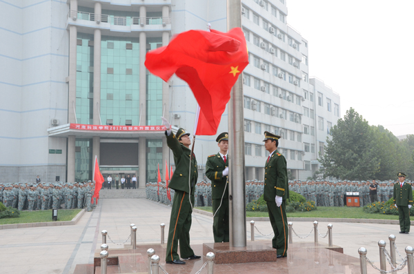 在新中国即将迎来63华诞之际,在党的十八大即将召开之时,为了弘扬爱国主义精神,展现2012级新生强烈的民族自信心和自豪感,9月24日,我校在致远广场隆重举行2012级新生升国旗仪式。校党委副书记张玉珍出席升旗仪式并作讲话。军训团团长常傲龙,宣传部、学工部、武装部、团委等相关单位负责人、全体帮训教官、军训连指导员和我校2012级全体新生参加了升国旗仪式。