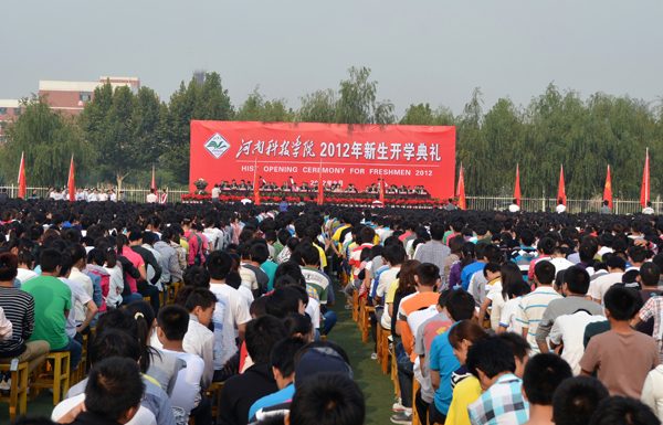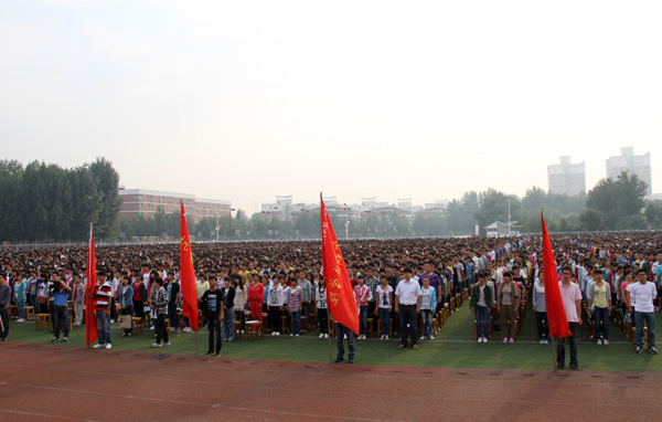 9月17日上午,天晴日朗、碧空万里,我校在东操场隆重举行了2012级新生开学典礼。校领导牛书成、张玉珍、王文鹏、刘兴友、窦玉玺、冯启高、王舜书、苗双虎、宋亚伟出席开学典礼,各相关职能部门负责人、各学院党政负责人、辅导员及2012级8000余名新生参加了开学典礼。