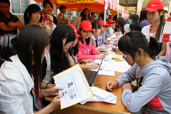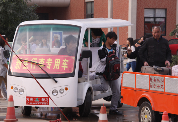 在学校致远广场上,各院系的接待人员整齐地一字排开,等候着新生的到来。一辆辆满载新生的接送大巴稳稳地停靠后,志愿者们快速地询问确认新生们的院系,然后将新生及行李送到各院系报到服务点进行入学手续的办理。从资格初审、档案收取、组织关系转入到宿舍钥匙、餐卡的领取,各院系实行“一对一”式的全方位服务。独自一人来校报到的外语学院新生聂姗姗正为沉重的行李犯愁,然而志愿者的帮助让聂姗姗格外轻松,在快速办完手续走进敞亮的宿舍后,她高兴地说:“多亏学长学姐的帮助,他们太热情了!”。