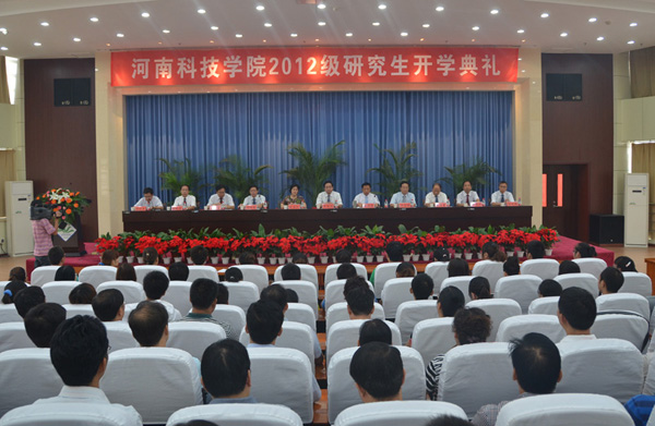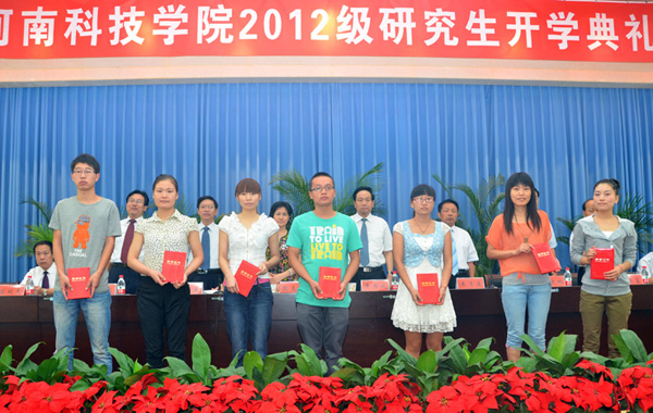 开学典礼在雄壮的国歌和激昂的校歌声中开始。副校长刘兴友首先宣读了《河南科技学院关于颁发2012级优秀研究生新生奖学金的决定》。伴随着欢快的音乐和热烈的掌声,校领导为在2012年研究生入学考试初试中取得优异成绩的同学颁发了优秀研究生新生奖学金荣誉证书。