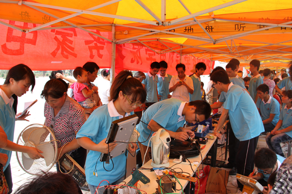 机电学院义务家电维修团队的队员们汗湿衣衫,连午饭都顾不上吃,为乡亲们维修家电50余台,心怀感激的乡亲们自费为同学们买来了饮料和雪糕。
