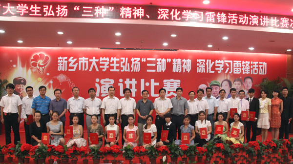 6月22日下午,由新乡市委宣传部主办的新乡市“大学生弘扬‘三种’精神、深化学习雷锋活动”演讲比赛在新乡医学院举行。包括我校在内的驻新六所高校共17名选手参加了比赛。
