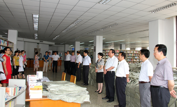 6月19日上午,冒着酷暑,校领导牛书成、王清连、张玉珍、王文鹏、窦玉玺、刘荣增、冯启高、王舜书、宋亚伟一行,在党委办公室、校长办公室、图书馆、基建处、保卫处、后勤管理集团等部门负责同志的陪同下,亲临图书馆现场检查指导搬迁工作。