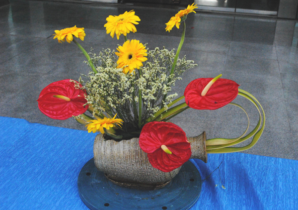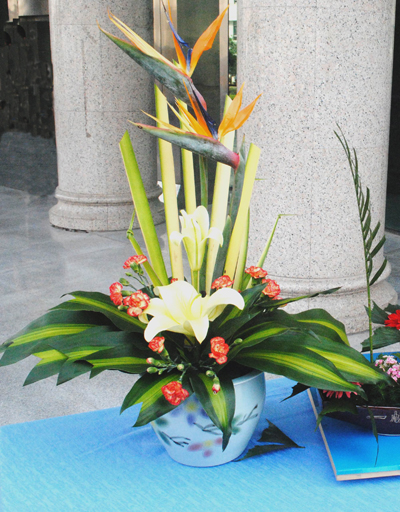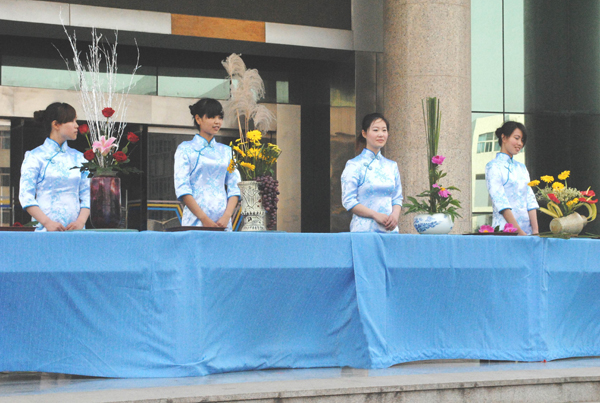 随后,开幕式现场举行了插花展演,整个展演分为花材展示和插花表演两部分。花材展示部分精选圣洁的百合、端庄的康乃馨、热烈的红掌、神奇的鹤望兰、娇艳的玫瑰等五种花材,一一为观众解读花的品行和寓意,使观众对花的灵性之美有了进一步的认识。在插花表演部分,10位同学以盘、瓶、缸、钵为花器,用他们精湛的技术为大家带来了赏心悦目的视觉享受。以鹤望兰、剑叶为主的“和谐”稳重大气;以非洲菊做主花,用小船作花器的“双帆竞渡”宛如学子在知识的海洋中徜徉;还有以鸢尾,刚草塑性的“三人行”,清幽、大方;以“春、夏、秋、冬”为主题的插花组合堪称一绝,以红掌、芍药、菊、玫瑰等作花材,融四季景观于方寸之间,将春花烂漫、夏花娇柔、秋果累累、冬花苍劲表现的淋漓尽致。
