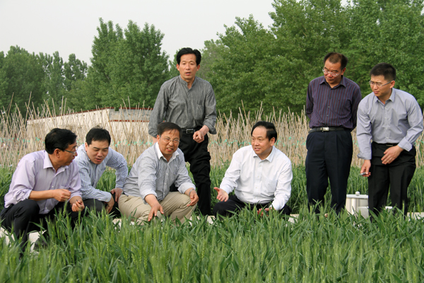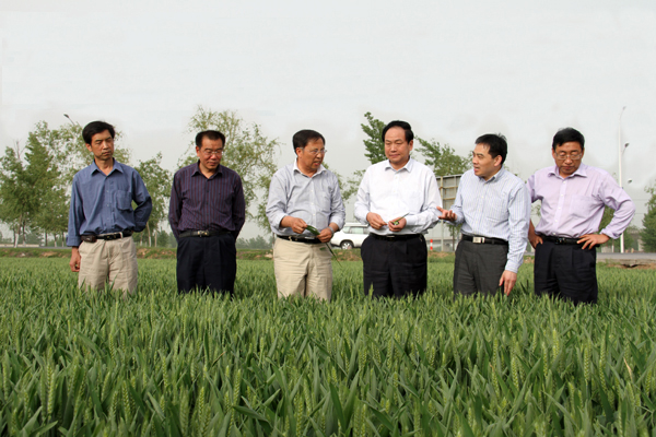 党委书记牛书成(右三)在农业部百农矮抗58小麦高产创建万亩示范田指导工作