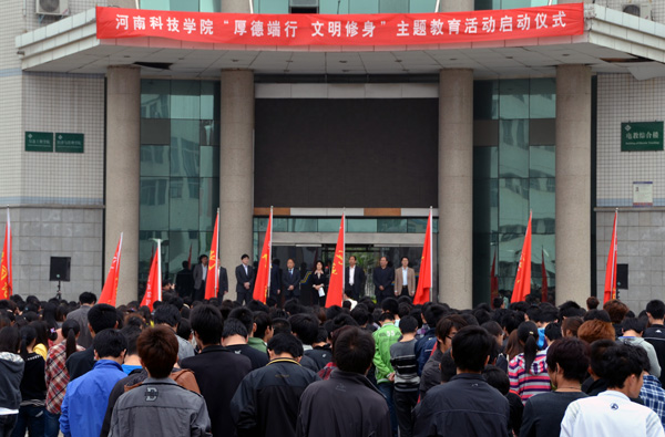 仪式上,副校长冯启高宣读了《关于开展“厚德端行 文明修身”主题教育活动的通知》。该活动的开展旨在为了进一步加强和改进大学生思想政治教育,深入推进社会主义核心价值体系建设,着力提升大学生的思想道德水平和文明素养,服务学生成长,促进学生成才。活动将从4月持续到12月,分宣传发动、组织实施、总结工作三个阶段进行。活动期间将陆续开展文明承诺签名、文明礼仪专题讲座、校园十大不文明行为调查、主题征文和演讲比赛、文明修身主题讨论以及“美化校园”志愿服务等一列活动。