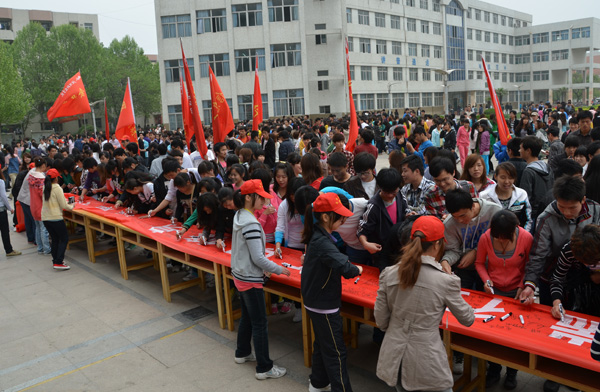 仪式结束后,与会师生井然有序的在“厚德端行 文明修行 共建和谐校园”横幅上签名承诺。