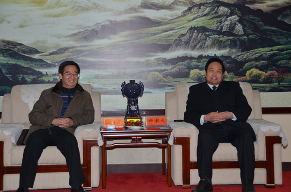 校党委书记牛书成与河南中医学院党委副书记、纪委书记郭海波进行亲切交谈