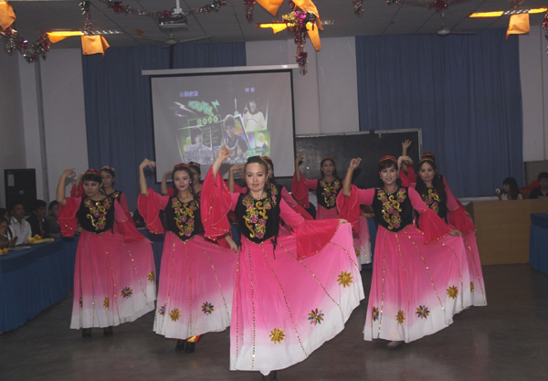 联欢会在充满浓郁民族特色的音乐声中正式拉开了帷幕。美丽的姑娘们和帅气的小伙子们身着漂亮的民族服饰跳起了欢快的舞蹈。集体舞《木卡姆》、《阿吐努希卡》,独舞《花园》、《美丽在你身上》将他们的热情和优美展现的淋漓尽致。学员们别具特色的“模特时装秀”一次次将晚会推向高潮。独唱《说爱你》、《在那遥远的地方》以及快板表演《群众之声》唱出了他们高昂向上的精神风貌、抒发了他们对祖国的热爱之情。