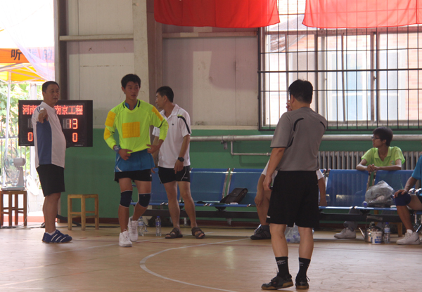 本次大赛共有裁判员14位,两人一组,平均每组要负责5场比赛的执法工作。队员们在赛场上驰骋,裁判员也要与队员们一起跑。据记者现场统计,5分钟左右,一位裁判员在自己半场要来回折返跑15-18趟,平均1分钟3趟。在跟上队员的节奏的同时,裁判员还要仔细观察队员动作,迅速准确地作出判罚。不用5分钟,每个裁判员的脸上就挂满了汗水。