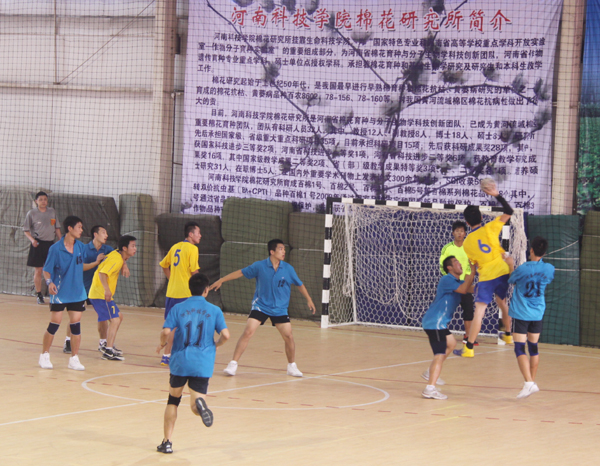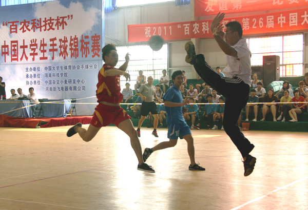 比赛中,河南科技学院队的守门员因犯规被裁判员直接罚下两分钟。面对“空门”,观众正在诧异这球咋打时,一位场上队员迅速套上了守门员脱下的战袍,套在身上,披挂上阵客串了一把守门员。这位临时“守门员”表现不错,赢得了现场的一片掌声。
