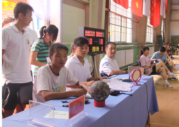 在比赛技术记录台,两位工作者正聚精会神的记录着比赛的状况。在小小的桌子上,摆着计时表、电子计分器、双音哨等工具,引起记者注意的是,在桌子一侧还放着一面镜子。经了解,原来是工作人员在用镜子时刻监控着背后的电子计分屏,唯恐出现意外。记录台的志愿工作人员共分为三组,轮流倒班。可以说,他们是比赛中最为紧张的人,技术统计、记录比分、掌控时间……,每一项工作都要“斤斤计较”、做到丝毫不差。据介绍,他们每记录两场比赛就要换班,以免高度紧张导致错误的发生。比赛中,他们总是最后一个离开,统计数据、上报数据,汇总情况,经常耽误了饭点。“昨晚比赛,上一组的志愿者忙到晚9点,因为辛苦,他们现在还正在宿舍睡觉。”一位记录台的志愿者告诉记者。