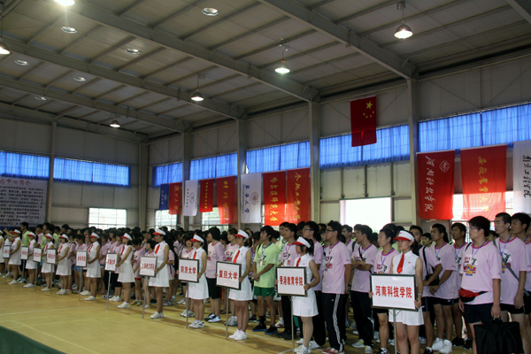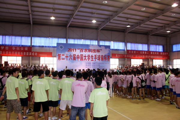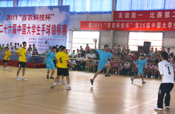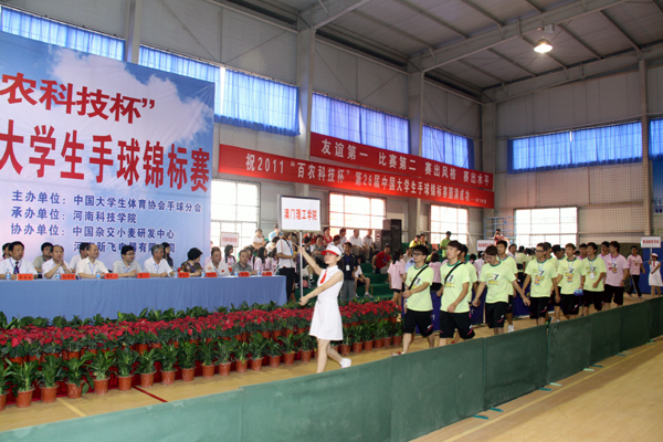 7月19日,2011 “百农科技杯”第二十六届中国大学生手球锦标赛在我校综合训练馆隆重开幕。本次大赛由中国大学生体育协会手球分会主办,河南科技学院承办,中国杂交小麦研发中心、河南新飞电器有限公司协办。这是河南省首次承办该项赛事。来自中国内地,中国香港、澳门特别行政区及新加坡等17所高等院校的22支参赛队将在6天的赛程中分6个组别展开激烈的争夺。