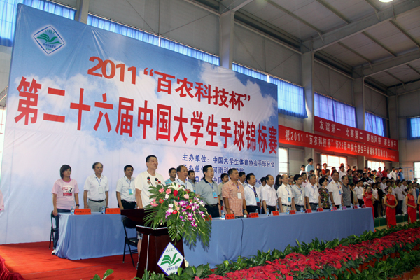 在热烈的掌声中,中国香港手球总会董事局主席、中国大学生手球协会名誉会长何仲浩宣布2011“百农科技杯”第二十六届中国大学生手球锦标赛开幕。