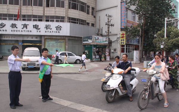 近日,我校派出多名职工,在新乡市金穗大道与劳动路交叉口的交通岗上,身披“文明出行志愿者”绶带,挥舞着交通指挥旗,有节奏地指挥着车辆和行人。