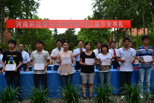 大会在雄壮的国歌和校歌声中开幕。首先,高职学院党委副书记丁福虎宣读了高职学院获得2011年河南省优秀大中专毕业生和河南科技学院优秀毕业生名单。在欢快乐曲中,与会领导为优秀毕业生代表颁发了荣誉证书。随后,毕业生代表白纪龙、在校生代表冯鑫和教师代表吴利平分别发言。
