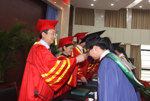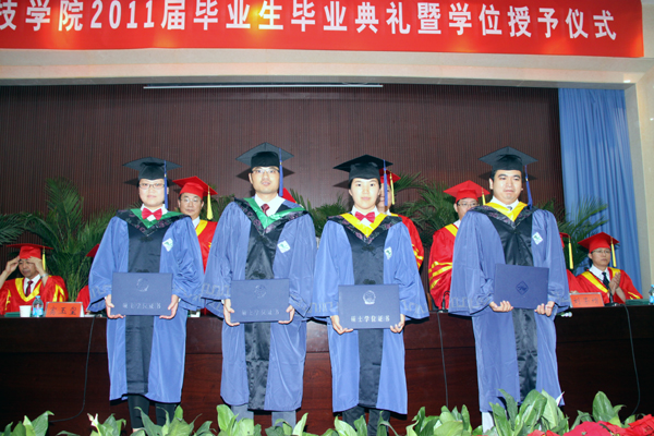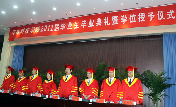 副校长窦玉玺教授首先宣读河南科技学院“关于表彰2011年优秀毕业生的决定”和获得“2011年河南省优秀毕业生”的学生名单,副校长刘兴友教授宣读《关于授予张亚娟等4位同学硕士学位的通知》和《关于授予李景峰等3098位同学学士学位的通知》。在热烈的掌声中,出席典礼的校党政领导为硕士毕业生、学士毕业生代表分别颁发了硕士学位证书、学士学位证书并为他们一一正冠拨苏。