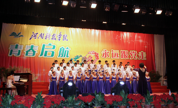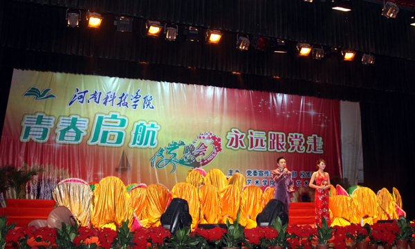党旗招展引领时代脉搏,骊歌飞扬启航靓丽青春。6月7日晚,我校西区操场人潮涌动、歌舞飞扬。由校党委宣传部、学工部、校团委联合主办,艺术学院、紫星艺术团承办的我校庆祝建党九十周年暨欢送2011届毕业生文艺晚会“青春启航,永远跟党走”在这里隆重举行。校党政领导张玉珍、郭海波、梁赖、张民校、王文鹏、窦玉玺、刘荣增、冯启高、王舜书、宋亚伟等亲临晚会现场,同各院系、各职能部门、各单位等相关负责同志以及近万名师生员工一同观看了演出。