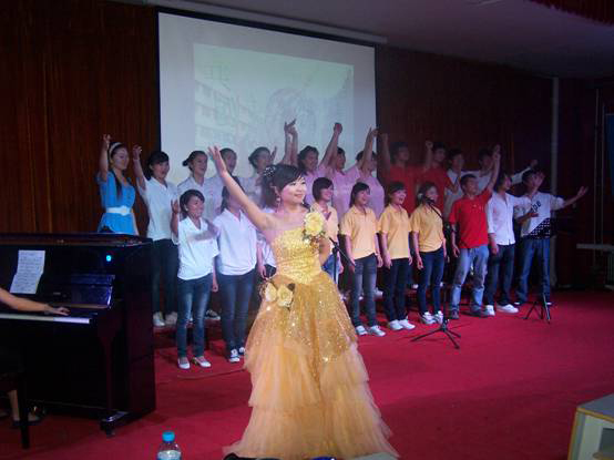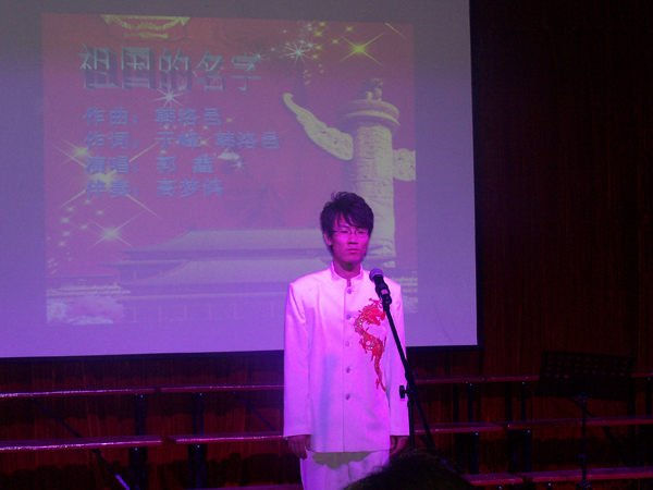 音乐是生命的和弦,歌曲《纪念》、《别》、《天堂》这几首歌曲用音符抒写了毕业后朋友即将别离的情感,音乐纯正透亮的音色、流畅如泉、淳朴真挚,使现场观众沉浸于音乐的美妙殿堂中。接着,同学们又激情的演绎了几首爱国歌曲《祖国的名字》、《仰望星空》、《祖国在我心中》,旋律荡气回肠,演唱者声情并茂,晚会再次达到高潮。