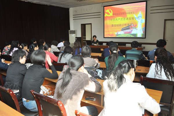 为深入学习、贯彻《中国共产党普通高等学校基层组织工作条例》》(以下简称《条例》),进一步推进党建工作,4月28日下午,第四党总支在图书馆五楼视听室召开了专题学习会。四总支全体党员及科级以上干部参加了会议,会议由第四党总支书记赵亦芳主持。