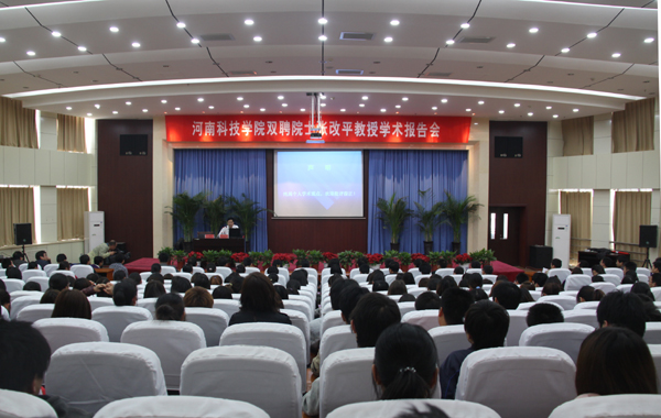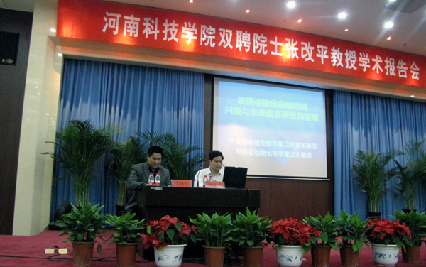 4月12日下午,应动物科学学院邀请,我校双聘院士、中国工程院院士、河南省农业科学院副院长、农业部动物免疫学重点开放实验室主任、博士生导师张改平研究员来我校作了题为“我国动物疫病防控的问题与未来疫苗研究的策略”的学术报告。报告会在新行政楼308报告厅举行。报告会由动物科学学院院长胡建和教授主持,动物科学学院部分教师、在读硕士研究生和本科生近300人聆听了报告。