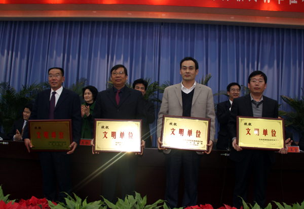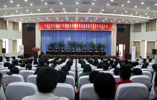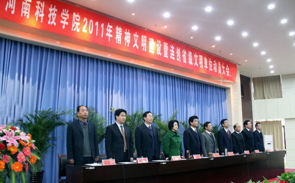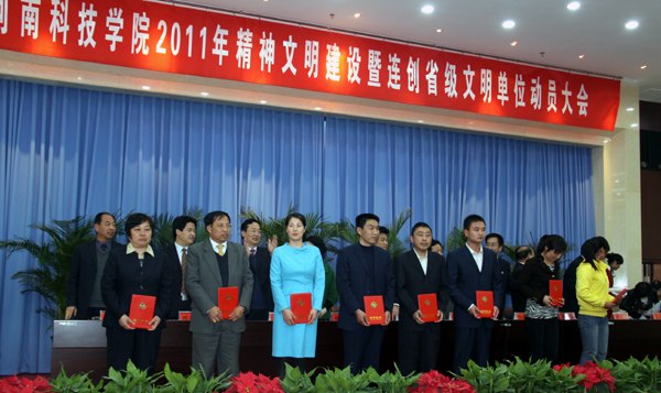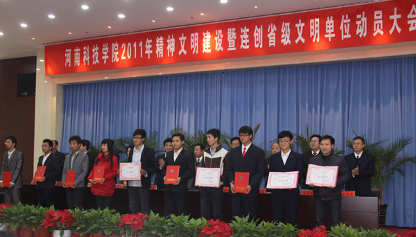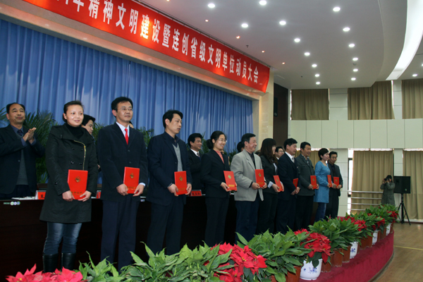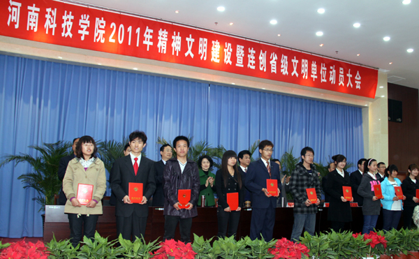 4月8日下午,我校2011年精神文明建设暨连创省级文明单位动员大会在行政楼三楼多功能报告厅隆重召开。大会总结了2010年精神文明建设工作,表彰了在2010年度精神文明创建活动中涌现出来的先进集体和先进个人,安排部署了2011年全校精神文明建设工作,对连创省级文明单位工作进行了动员。校党政领导严全治、王清连、张玉珍、郭海波、王文鹏、窦玉玺、刘荣增、冯启高、王舜书、宋亚伟,全校正处级干部,各院系党委、党总支副书记,辅导员,受表彰的文明集体和文明个人代表300余人参加了大会。