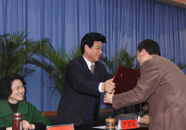 校党委书记严全治为获文明单位标兵的经济与管理学院颁奖