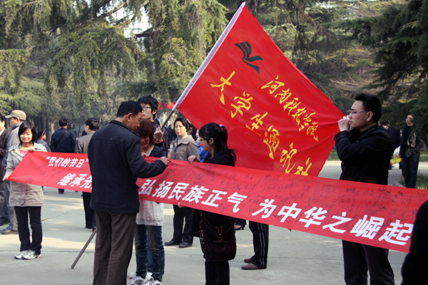市民们在“继承先烈遗志,弘扬民族正气,为中华之崛起而奋斗”横幅上签名