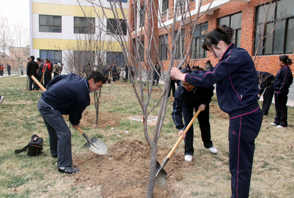 在植树现场,郭海波副书记、冯启高副校长带领大家一起投入到快乐的劳动中去,同学们分工协作,热情高涨,扶苗、培土、扶正、踩实、浇水,忙的不亦乐乎。不一会,园地里便挺立起一株株小树,大家脸上都洋溢着劳动的喜悦。一位同学高兴地说,参加义务植树活动非常有意义,自己要好好照顾这些小树,以后每次来河南都要来看它们。