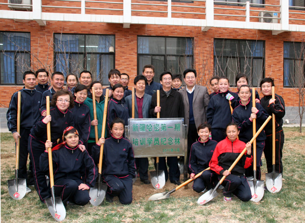 植树后,郭海波副书记、冯启高副校长、新疆培训班驻校领队杨世德和同学们在“新疆哈密第一期培训学员纪念林”标识牌前合影留念。