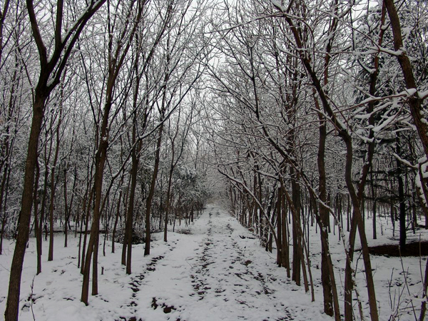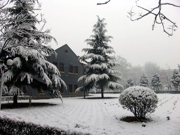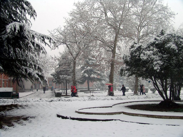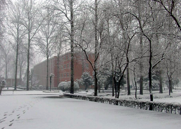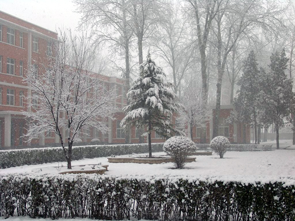 ,天降瑞雪,为久旱的大地带来勃勃生机,也为师生们带来了快乐,校园内一片银妆素裹、分外妖娆,宛如一个晶莹剔透的冰雪世界。图为百泉校区校园雪景。