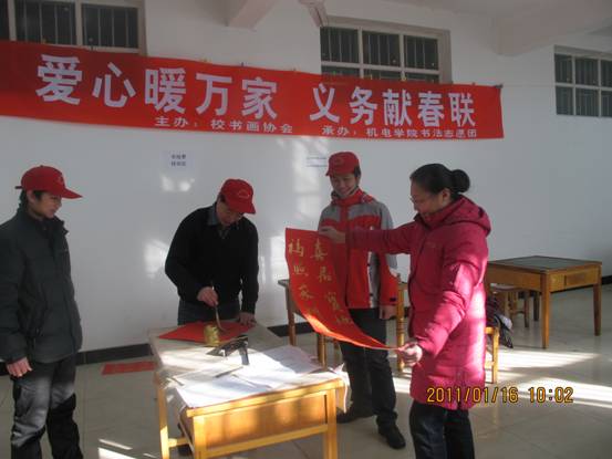 “金虎辞旧岁,玉兔迎新春”。在新春佳节来临之际,为增添喜庆祥和的节日氛围,元月15、16日,由我校书画协会主办、机电学院书法志愿团承办的“爱心暖万家,义务献春联”活动在老干部活动中心举行。两天来,书法志愿团共义务书写春联120余副,为全校教职工带去了新年的祝福,受到大家的欢迎和好评。