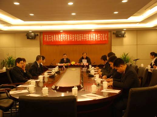 会上,新科学院院长梅宪宾和河南天地粤海酒店宫春海总经理签定了河南科技学院新科学院与河南天地粤海就业实习基地协议。