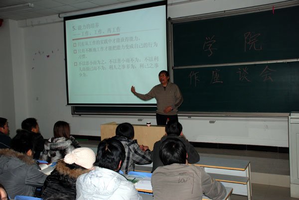 旦书记说,作为学生,学习仍应放在第一位,在保证自己学习不受影响的前提下,努力为学生成才、成长服务。学生干部应针对自身特点经常进行工作总结,及时发现问题、分析问题、解决问题,把自己培养成国家和人民需要的优秀大学生。