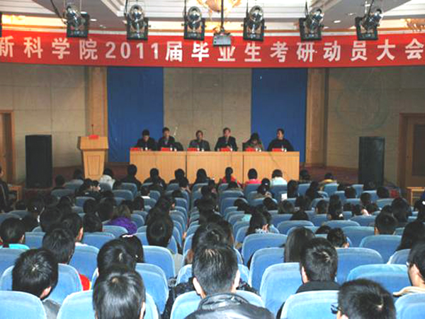 12月21日中午,新科学院2011届毕业生考研动员大会在图书馆二楼学术报告厅隆重举行。校长助理、新科学院院长梅宪宾,新科学院党委书记旦勇刚、副书记冀红举,副院长孟丽、张涛、王洪亮,各系辅导员及学生代表参加了此次动员大会。