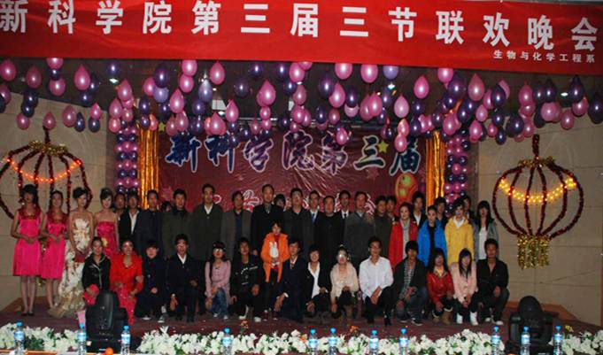 12月20日晚,新科学院 “第三届三节(冬至、元旦、春节)联欢晚会”在图书馆二楼学术报告厅举行。校长助理、新科学院院长梅宪宾,校团委书记郭立,新科学院党委书记旦勇刚,校长办公室副主任张忠迪,食品学院党委副书记樊跃峰,数学系党总支副书记胡付广,新科学院党委副书记冀红举,副院长张涛等出席了晚会。