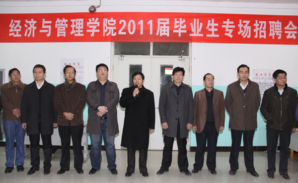 12月19日上午,经济与管理学院在10号楼一楼大厅举办了2011届毕业生专场招聘会。校党委宣传部部长姚刚、校团委书记郭立、校办副主任张忠迪、校学工部副部长兼学生处副处长云鹏、招生就业处副处长张平、经济与管理学院党政领导出席了开幕式。经济与管理学院2011届毕业生参加了招聘会。