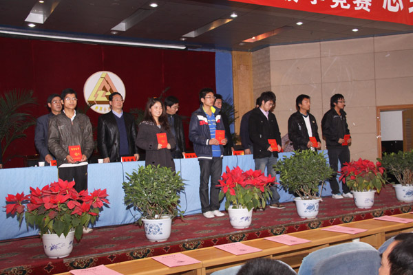 副校长王文鹏宣读了第五届“英才杯”大学生数学竞赛表彰决定。资源与环境学院、机电学院被授予“优秀组织奖”。41组123名学生受到表彰,其中王博等4组选手荣获一等奖,王月等7组选手获得二等奖,赵晶晶等10组选手获得三等奖,赵冉冉等20组选手获得三等奖。