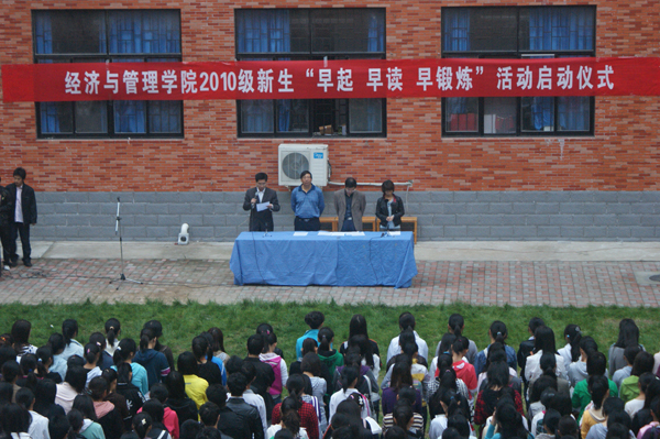 为进一步加强学风建设,营造经济与管理学院浓厚的学习氛围,引导大一新生养成良好的学习和生活习惯,促进学生“德、智、体”全面发展,经济与管理学院于10月11日早上6时30分,在10号教学楼天井举行了“早起早读早锻炼”活动启动仪式。经济与管理学院全体党政领导、辅导员和2010级全体新生参加了仪式。
