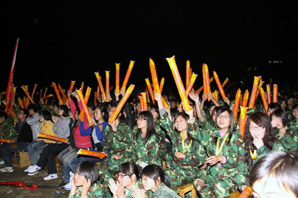 军歌嘹亮,帮训教官们英姿飒爽,铿锵有力的《崇尚荣誉》、《小弹壳》唱出了军人的无尚荣光,慷慨激昂的军歌燃起了全场同学们的热情,大家和着教官的节奏同声齐唱,台上豪情万丈,台下激情似海。霎时,歌声、掌声、欢呼声响彻整个西操场,整个西操场变成一片欢乐的海洋!