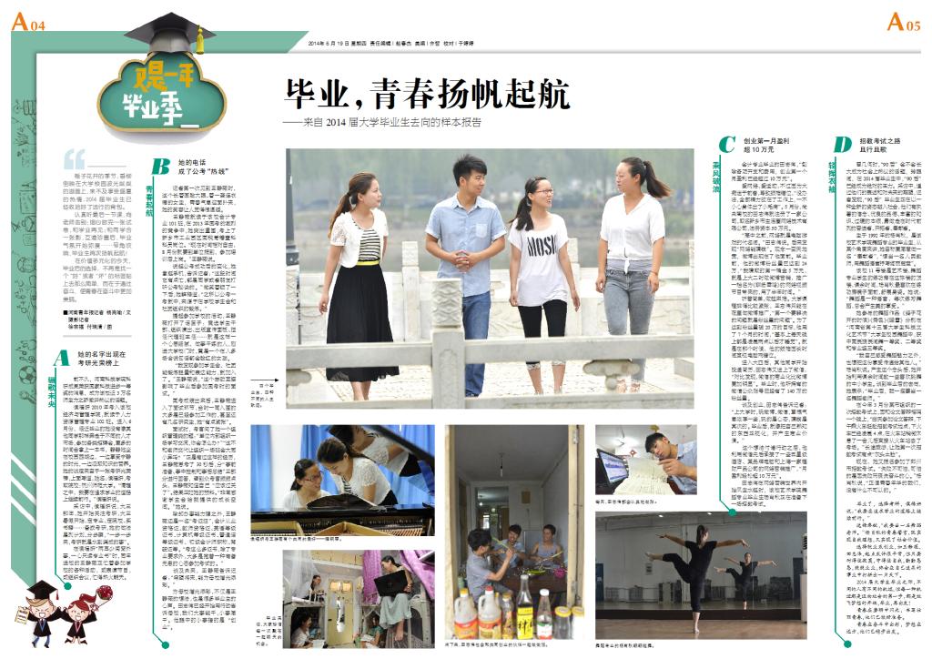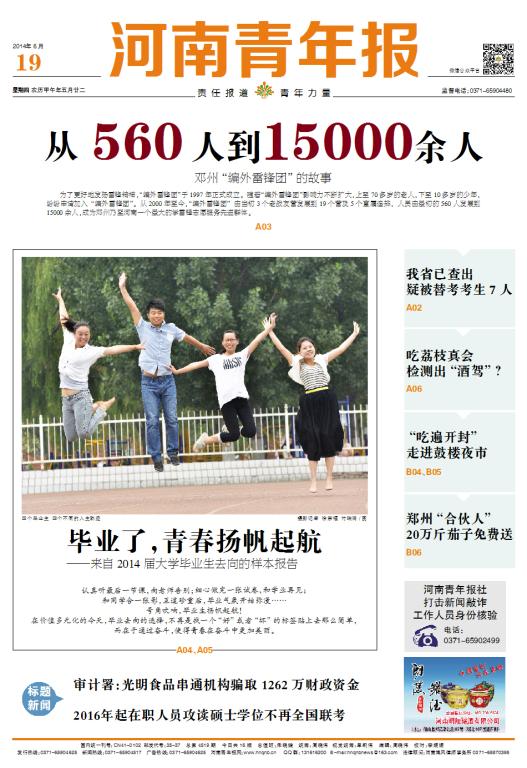 6月19日,《河南青年报》以“毕业了,青春扬帆起航”为题,以整版的篇幅,对我校2014届毕业生就业过程中的典型代表进行了报道,详情请点击: