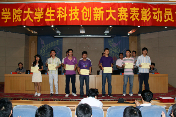 教务处常务副处长赵良宣读了我校学生在2009年全国大学生科技创新大赛中的获奖情况。我校在全国大学生电子设计竞赛中取得河南赛区一等奖两组、二等奖两组、三等奖两组、成功参赛奖七组,创造我校历史参赛最好成绩;另外,我校在“挑战杯”全国大学生课外活动作品竞赛中获得赛区三等奖一组;在“天华杯”首届全国电子专业人才设计与技能大赛获得国家三等奖三组、赛区二等奖两组;在全国三维数字化创新设计大赛中,获得河南赛区一等奖两组、三等奖两组。