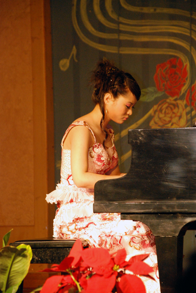 06级学生刘敬芳、王一、姜玥、刘文佳四位同学为大家带来了多首中外钢琴名曲,从李斯特的《弄臣》到肖邦的《军队波兰舞曲》,从《浏阳河》、《向阳花》到《谷粒飞舞》,被同学们演绎的生动、优美,惟妙惟肖,将现场观众带入到一个梦幻般的音乐世界。音乐会在王一同学一曲《黄河愤》的精彩演绎中圆满结束。整台表演精彩纷呈,不时引起观众们阵阵热烈的掌声。