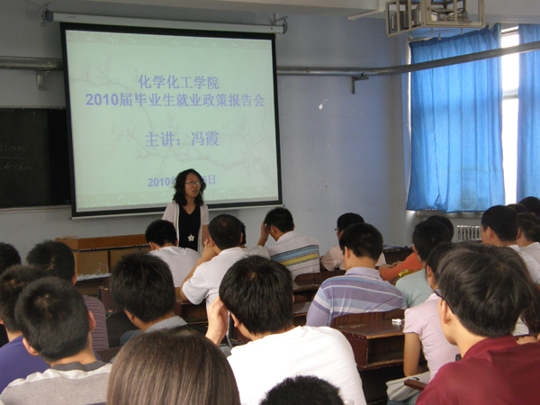 为促进2010届毕业生顺利就业,5月26日上午,化学化工学院在1号教学楼401教室举行了一场就业政策专题报告会。校招生就业处就业科科长冯霞结合化工专业实际为目前还没签订协议的80余名同学做了专题政策咨询报告。报告会由化工学院党委副书记王冰蔚主持。